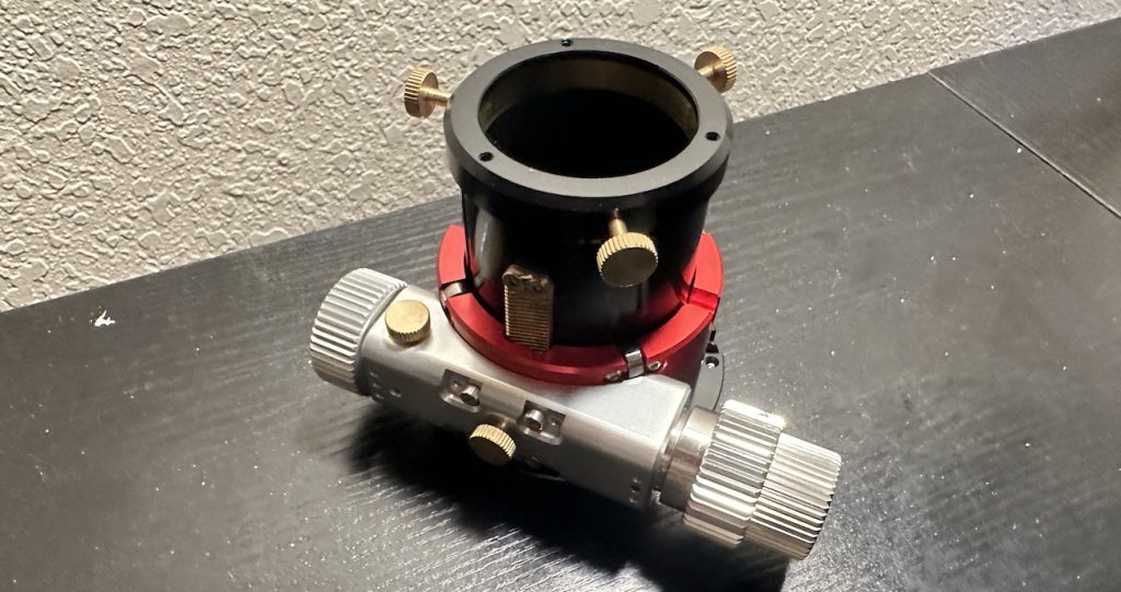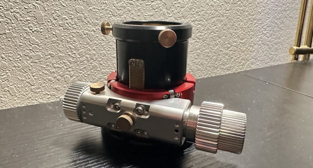- Antares 2″ Low-Profile Dual-Speed Hybrid Reflector Focuser: Also sold under a few other brands, this hybrid focuser features a sliding extension tube that can be used to reach focus without needing an additional separate piece of hardware. Unfortunately, with most eyepieces that I’ve tried it with, it ended up being a bad idea, as there is plenty of play/wobble in this sliding auxiliary draw tube. But in any case, the focuser itself is excellent, and the low profile helps me minimise the size of the secondary mirror when I’m building my own telescope.