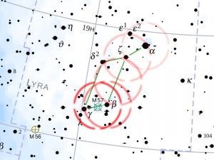 You would start in the upper right, which is the bright star Vega. Then you would progress to the next star and the next until you reach the bottom location, which would have the Ring Nebula, M57, which is not visible to the naked eye but would be centred in the Telrad central ring.